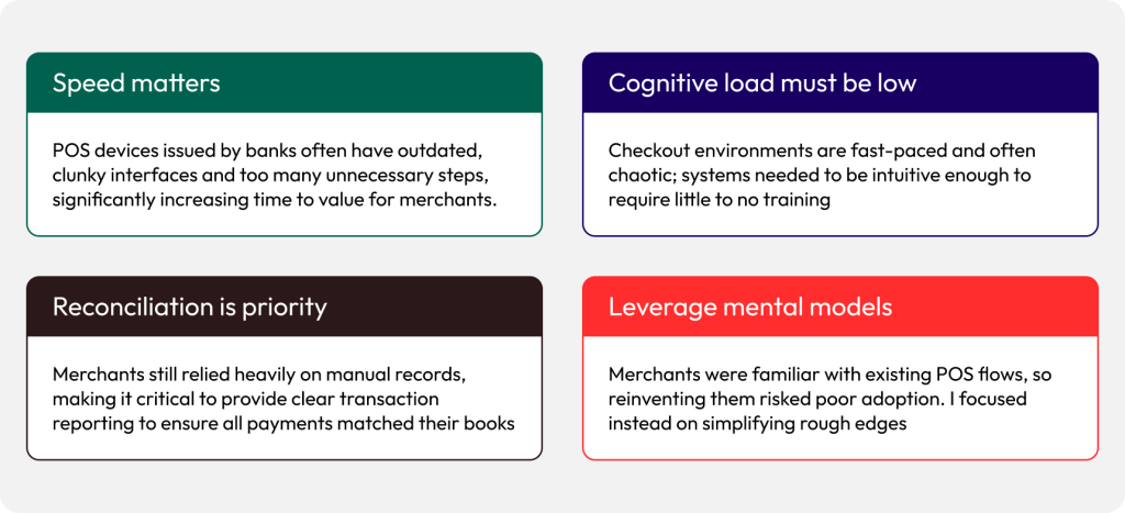 From the outset, I aimed to ground Neo in real merchant needs rather than assumptions, knowing that designing a new POS required a deep understanding of both the physical and psychological aspects of the user experience.