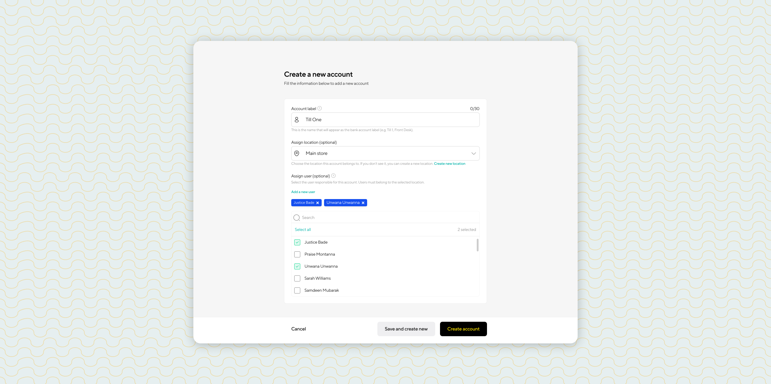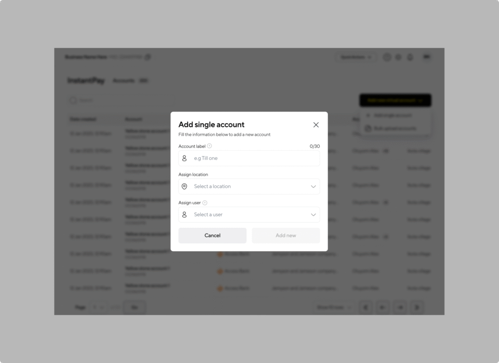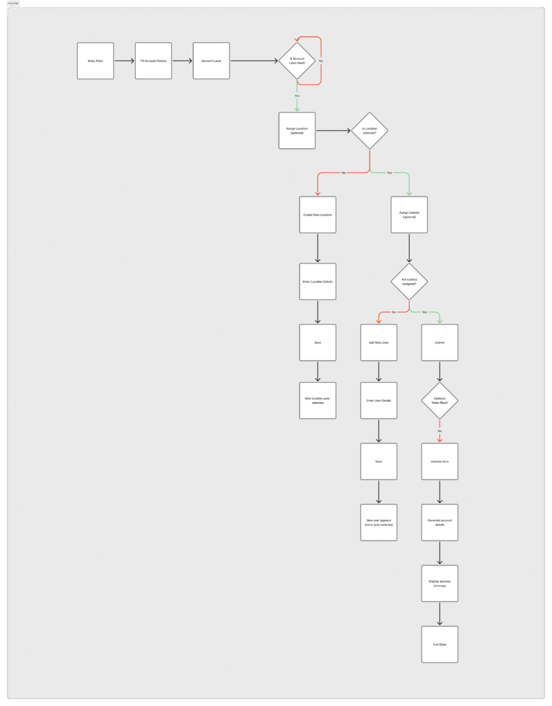 The problem arose when merchants tried to assign the account to a new location or user that didn’t already exist. There was no way to create them within the flow, forcing merchants to cancel, navigate elsewhere to add them, and then restart the process.