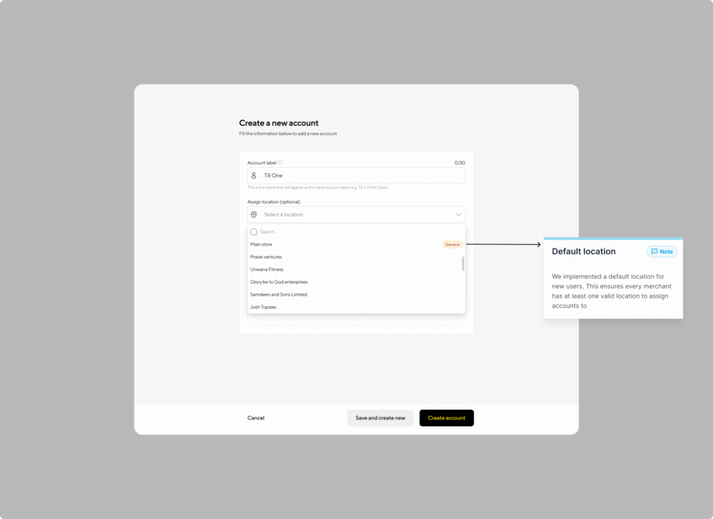 This ensures every merchant has at least one valid location to assign accounts to – simplifying the setup process, especially for first-time users.