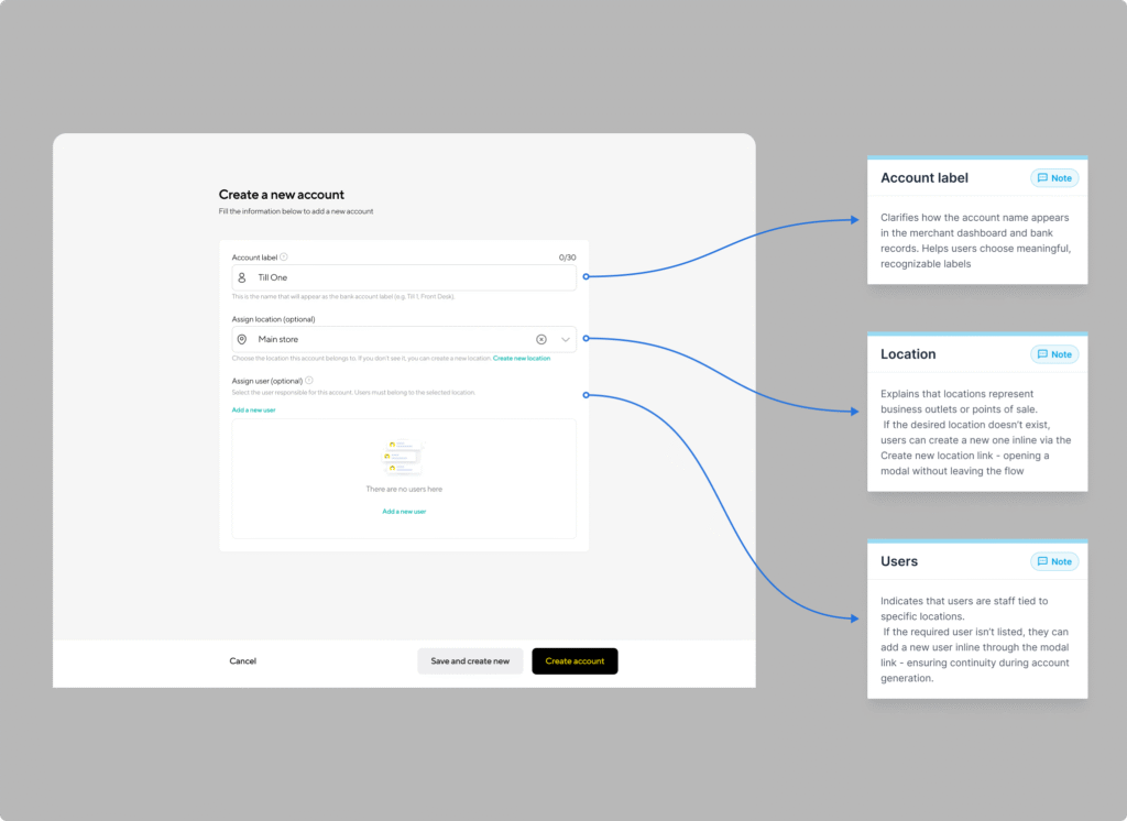 The findings were clear: merchants didn’t find the flow intuitive. Many expected to set everything up – account, location, and users – in one go. Having to leave the flow just to create a new location or user felt unnecessary and interrupted their momentum.