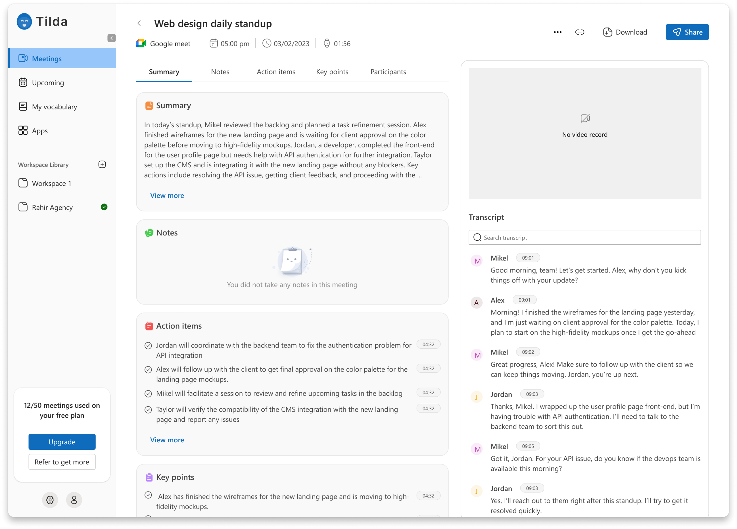 Tilda AI can automatically identify and list action items and tasks from meeting discussions. This helps clarify responsibilities and ensure that follow up actions are clearly assigned.